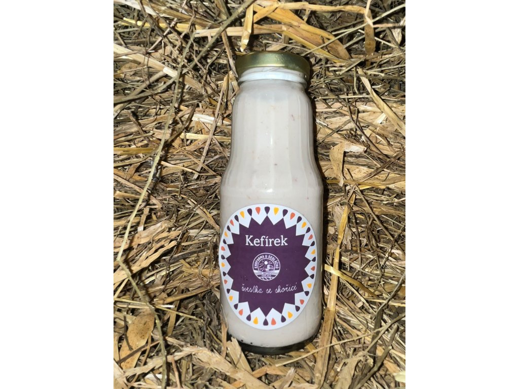 KEFÍREK – ŠVESTKA SE SKOŘICÍ. OCHUCENÉ KEFÍROVÉ MLÉKO. KYSANÝ MLÉČNÝ VÝROBEK. Hmotnost: 300 g. Složení: kravské mléko, švestkový sirup (švestky, skořice, třtinový cukr, kyselina citrónová, filtrovaná voda), kefírové kultury. Obsah tuku: min. 4,2 %. Skladujte při teplotě 2-8°C. Výrobce: Jan Sedláček, Háje 3, 26301 Hřiměždice. CZ 21851018.